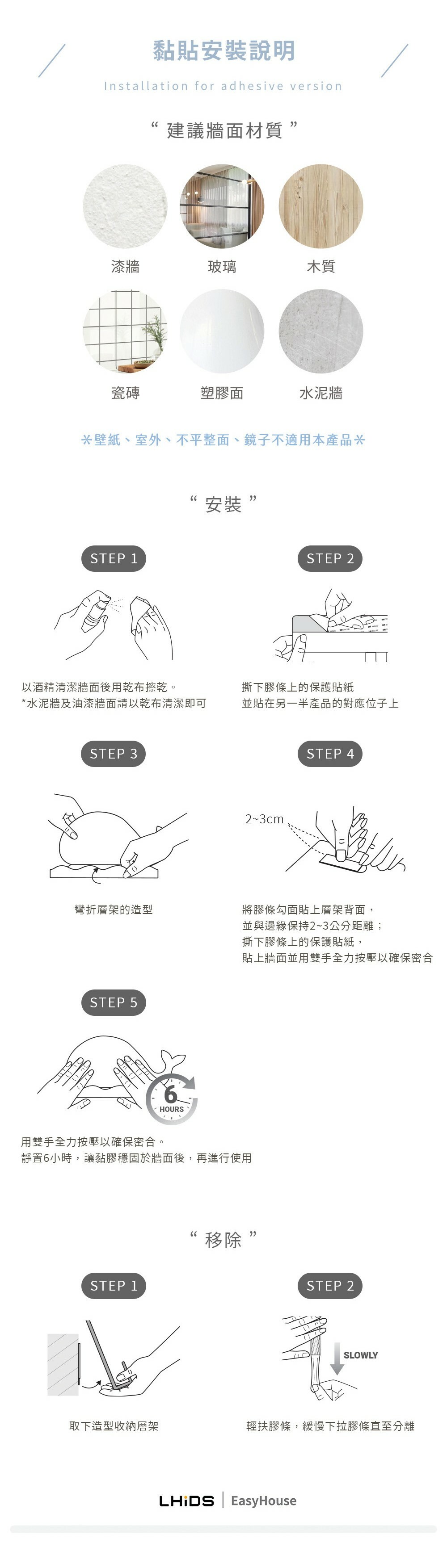 兩個版本可以將產品安全牢固地貼在牆面上,撕下後不留殘膠或傷牆,且替換膠條後便可重複粘貼